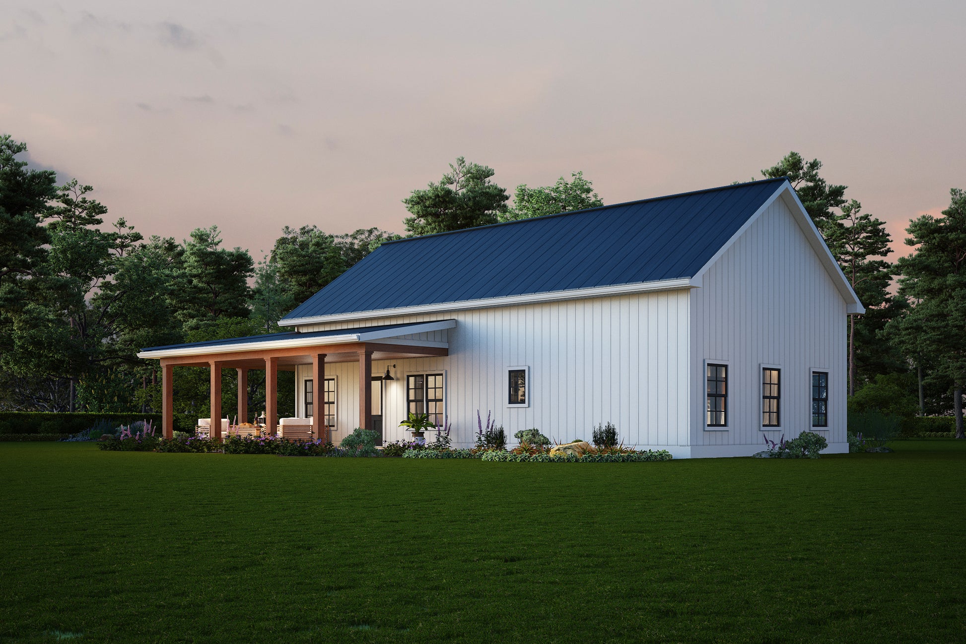 This charming 2-bedroom, 2-bath barndominium plan features a stunning wraparound porch that adds both curb appeal and outdoor living space. The kitchen is designed for functionality, complete with a central island and a spacious pantry. Laundry units are conveniently tucked into the hallway across from the main bathroom, keeping everything within easy reach. Ideal for those looking to downsize without sacrificing comfort, this versatile plan can be built using a metal building kit, post-frame kit, or traditional wood-frame kit—offering a smart pricing advantage in any market.