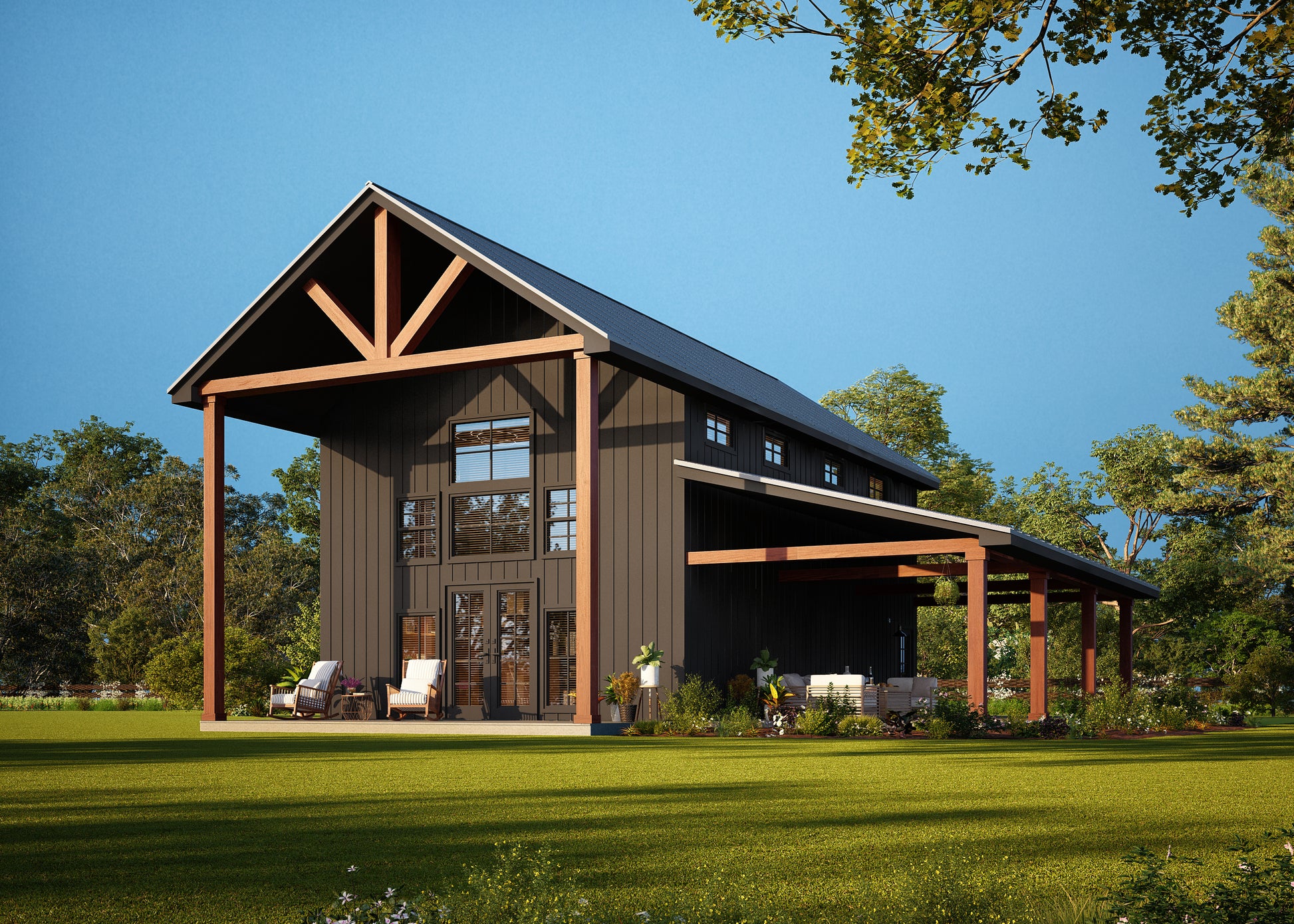 Barndo 1525 is a bold and stylish 3-bedroom, 2-bath barndominium floor plan designed for those who love to entertain. Its sleek black exterior, paired with a matching metal roof, is beautifully accented by rustic wooden beams and stacked stone pillars—creating a striking modern-rustic look that stands out in any setting.