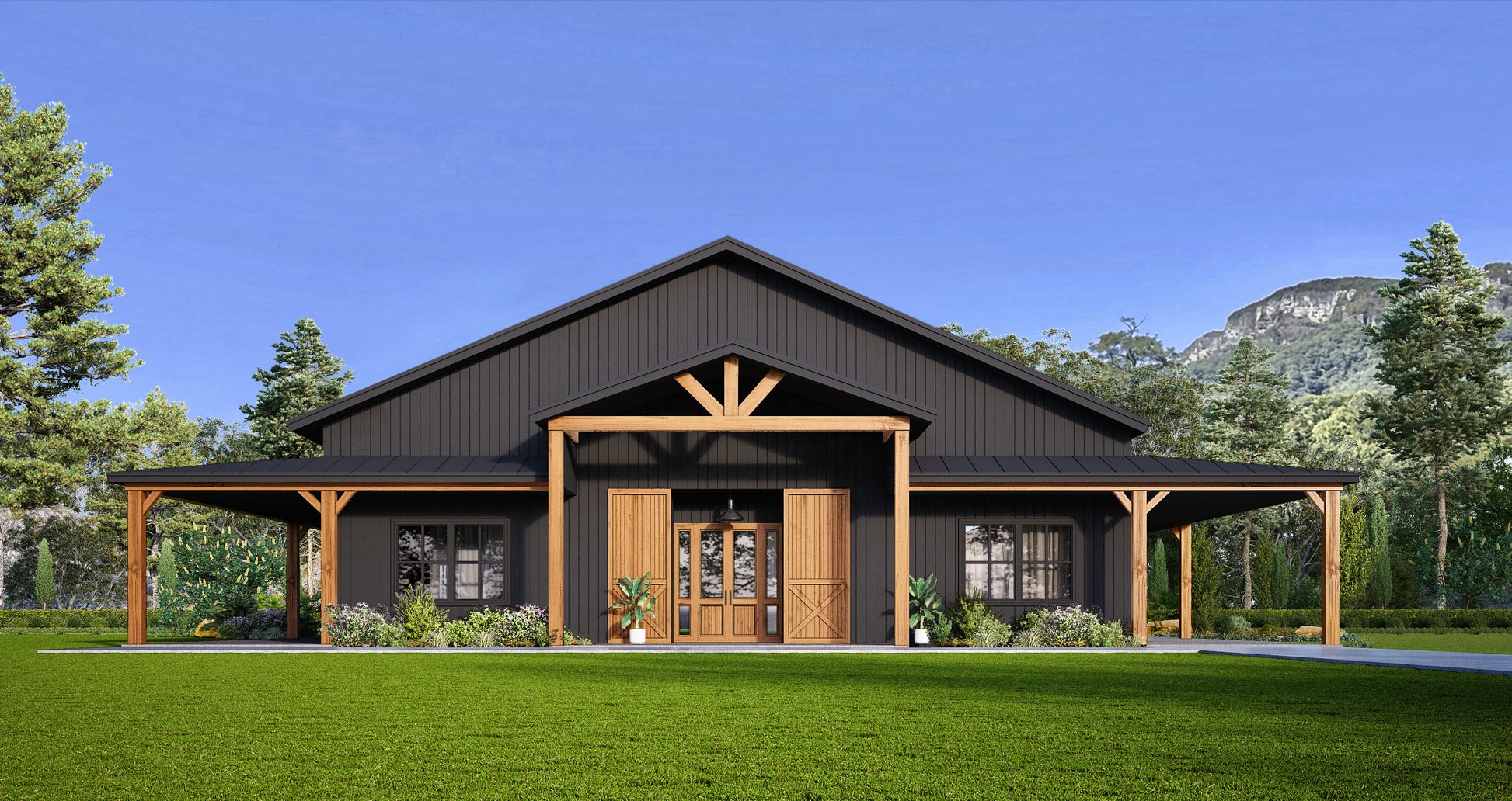 This stunning 3-bedroom, 2-bath barndominium plan features a beautiful wraparound porch that adds charm and outdoor living space. Grand barn-style doors open into the spacious great room, creating a dramatic and welcoming entryway. The master suite offers a generous walk-in closet and a luxurious master bath complete with a dreamy wet room for the ultimate spa-like experience.