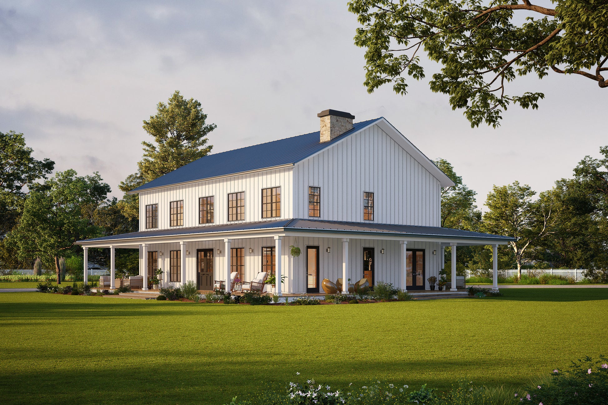 The B2613 Country Barndo captures the timeless charm of farmhouse living with the versatility and durability of a modern barndominium. Its inviting wrap-around porch offers plenty of space for outdoor relaxation, entertaining, and soaking in the beauty of country life.