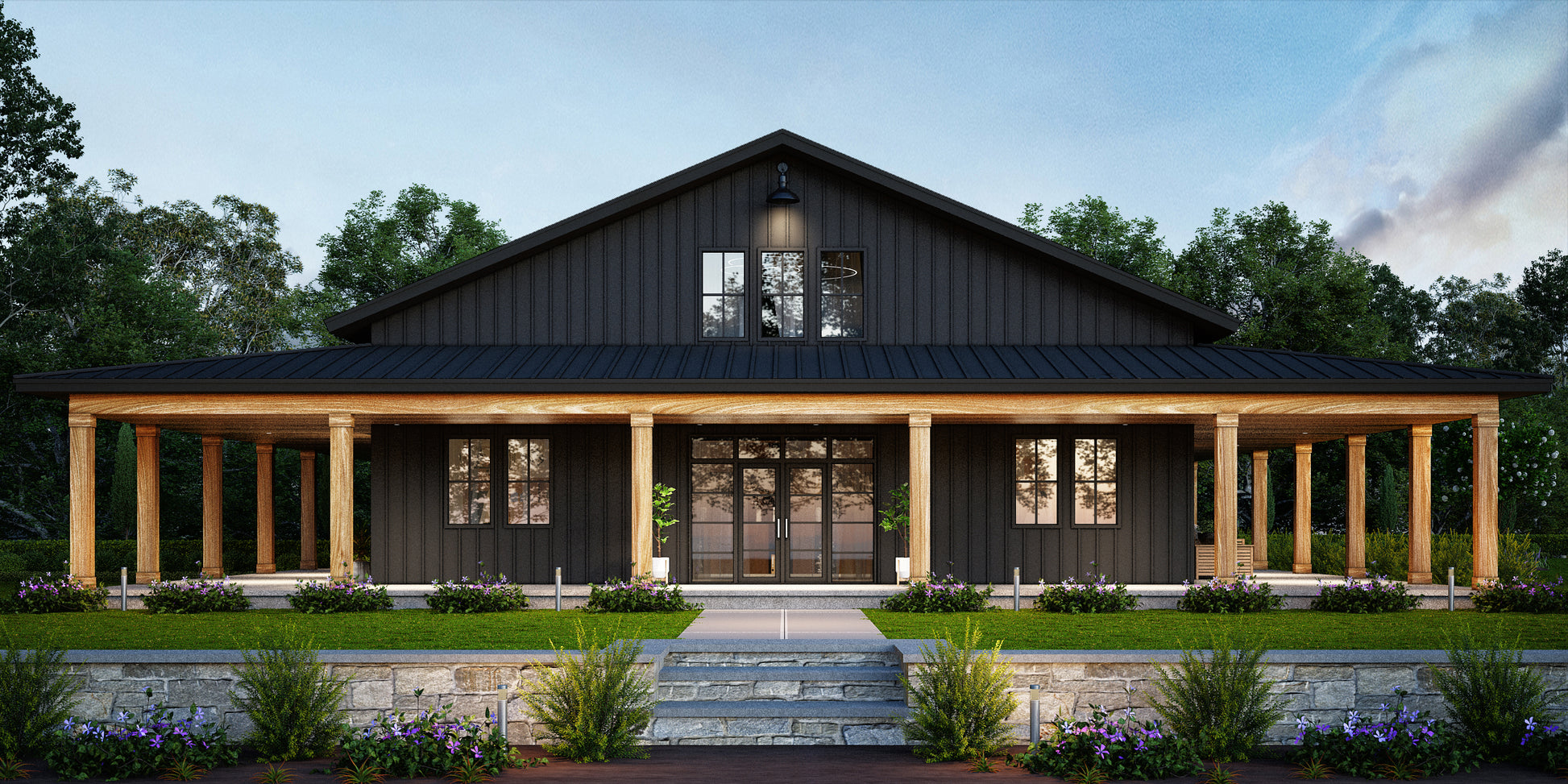 This 3-bedroom, 2.5-bath barndominium plan combines modern comfort with timeless farmhouse charm. A beautiful wraparound porch welcomes you home and provides the perfect space for relaxing outdoors. Large glass entry doors fill the open living and dining area with natural light, creating a warm and inviting atmosphere.