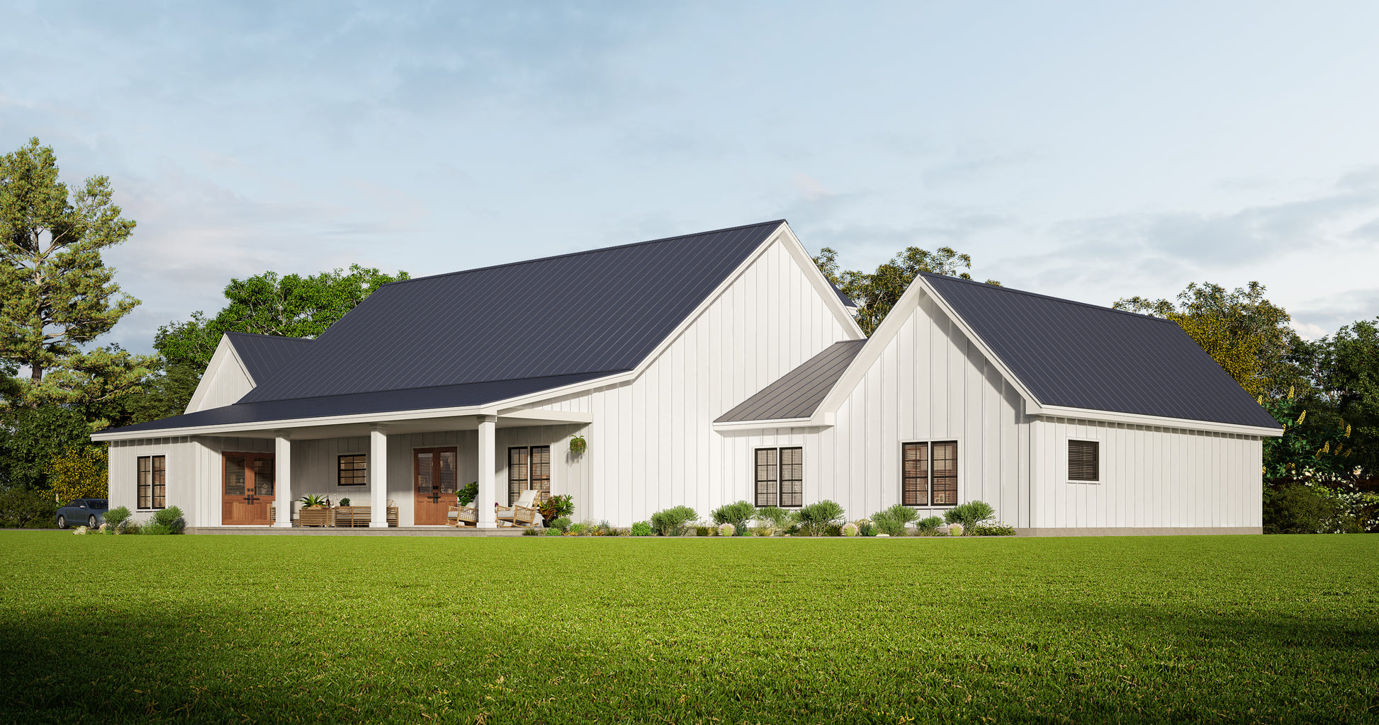 This versatile farmhouse design can be built with either a premium metal building kit or a conventional wood frame kit—offering flexibility and cost advantages in any market.