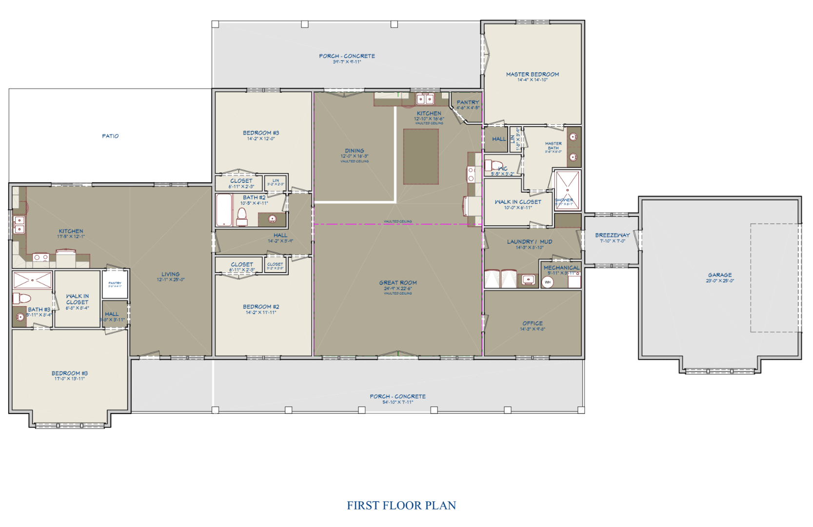 This modern farmhouse plan features 4 bedrooms and 3 baths, including a fully equipped in-law suite. The main living area offers an open layout with vaulted ceilings that span the great room, dining area, and kitchen, creating a bright and spacious atmosphere perfect for family gatherings.